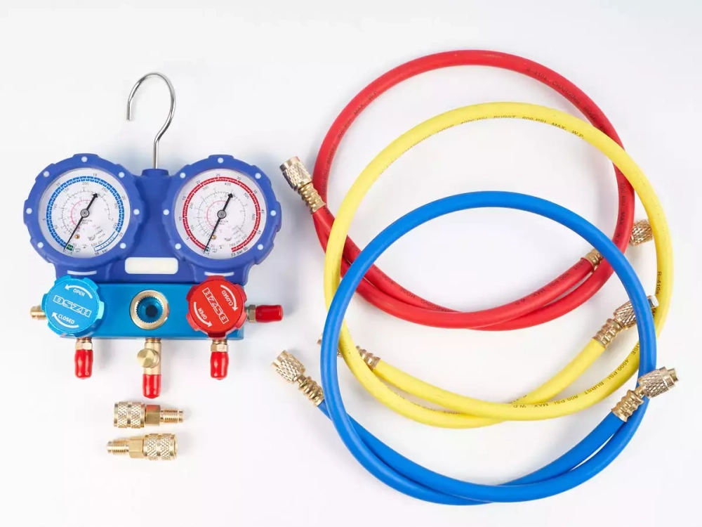 Поставляется в кейсе в комплекте с заправочными шлангами длиной 90 см 1/4" SAE (800 PSI) и двумя адаптерами R410 x R22.